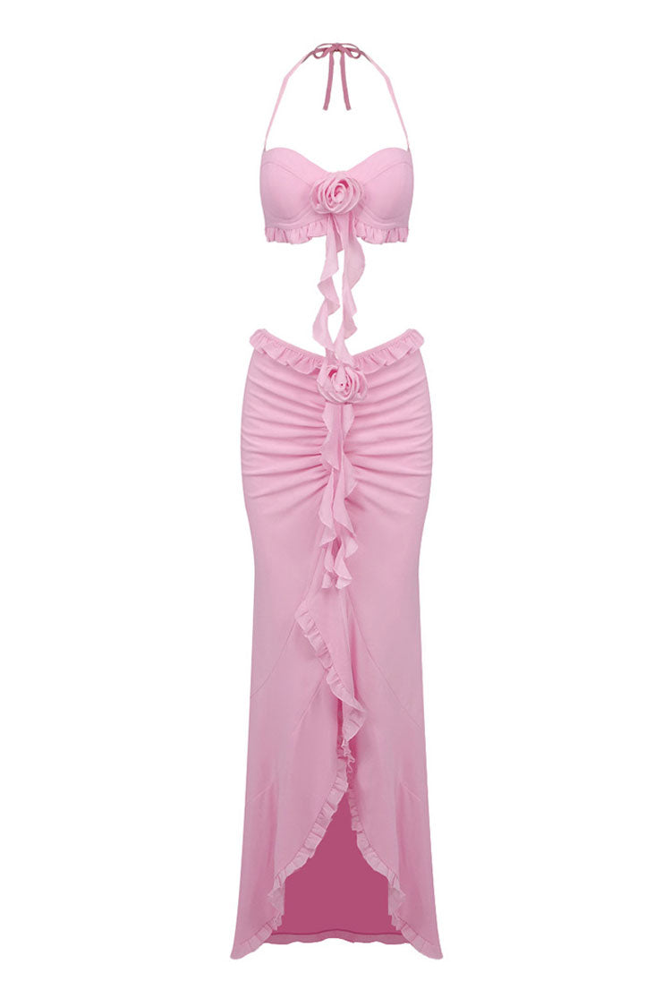 Flowy Halter Tie Rose Bra Ruched Mesh Draped Ruffle Two Piece Maxi Dress