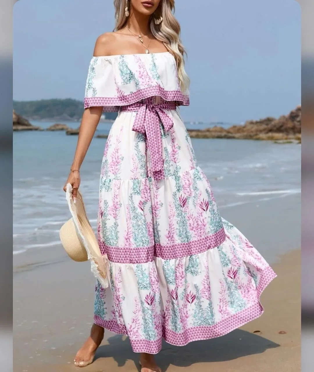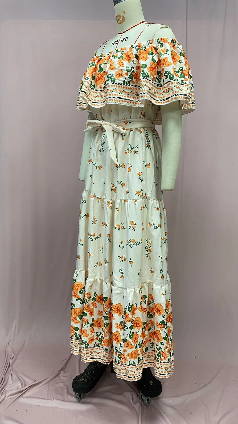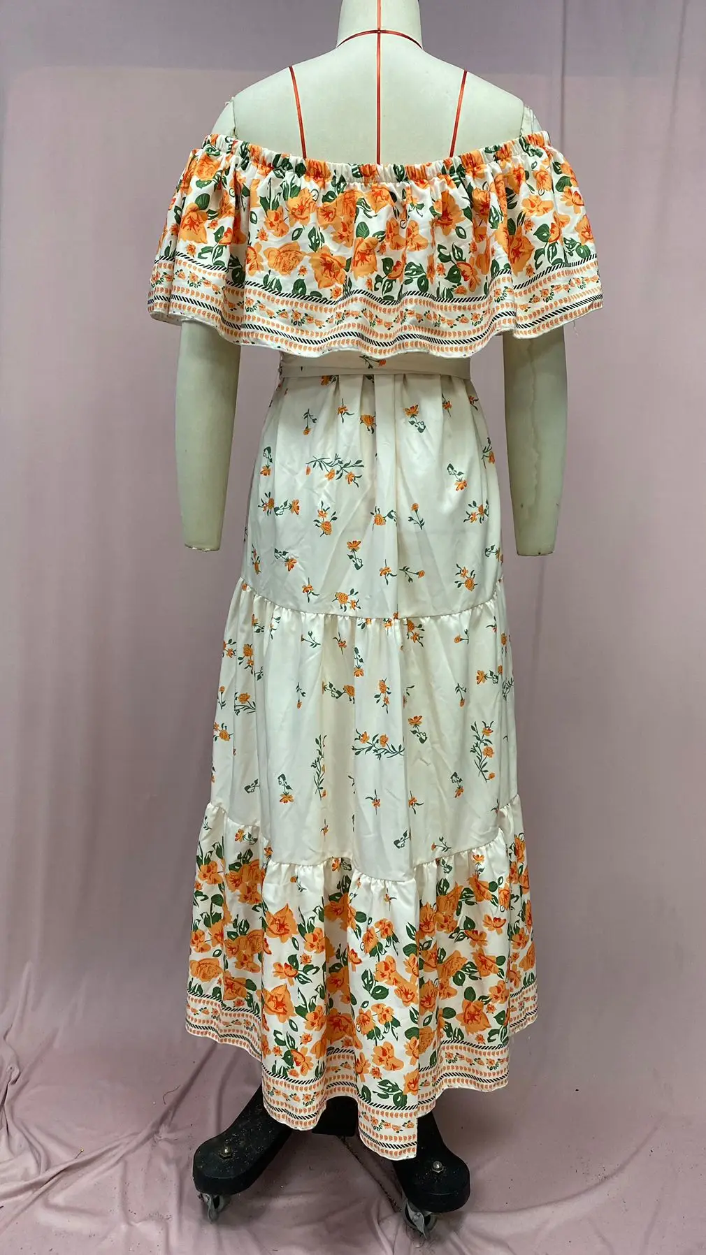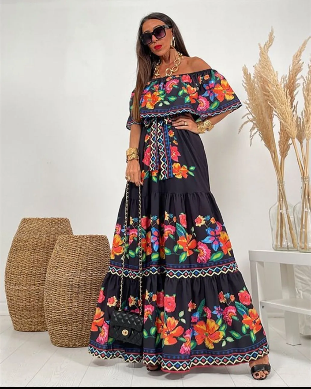 Boho Off-Shoulder Ruffle Floral Print Maxi Floral Dress
