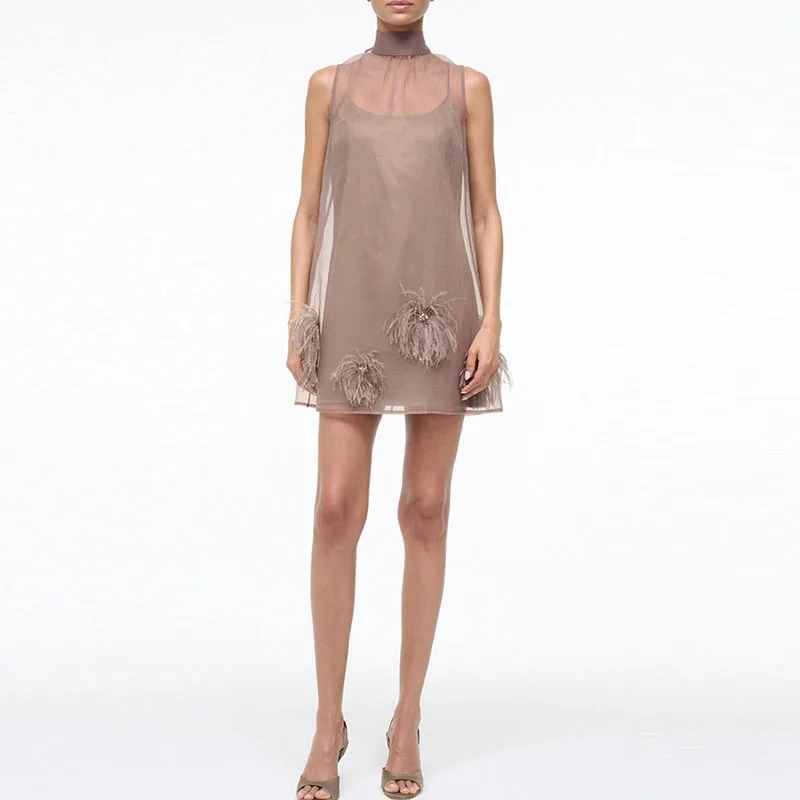 Elegant A-Line Feather Mesh Splicing Mini Dress for Women