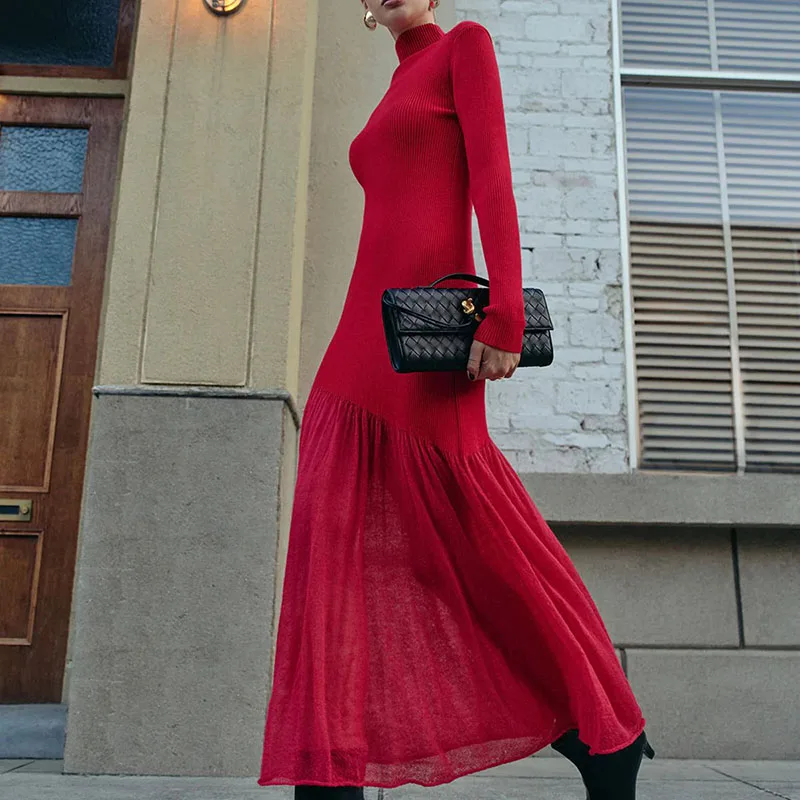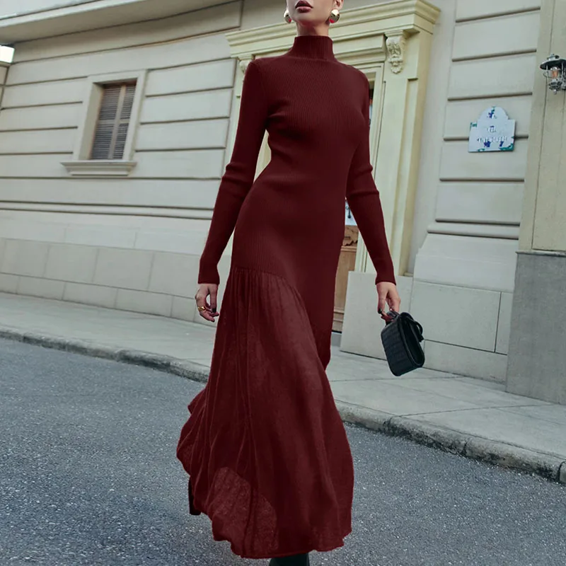 Elegant Fashionpara High Collar Knitted Maxi Dress for Fall