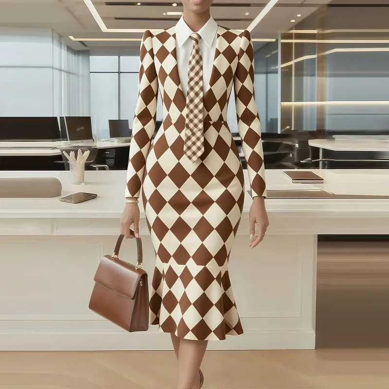 Elegant Lattice Print Fishtail Dress for Autumn Events