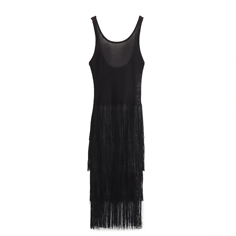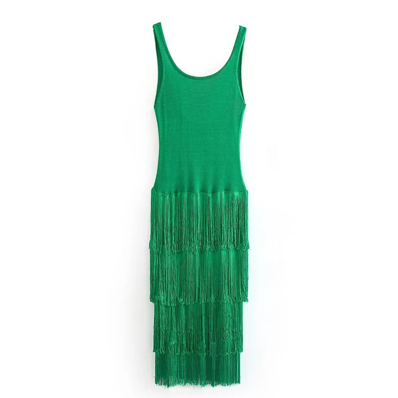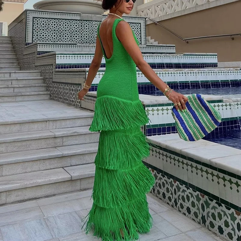 Elegant High Waist Knit Maxi Dress with Tassel Detail
