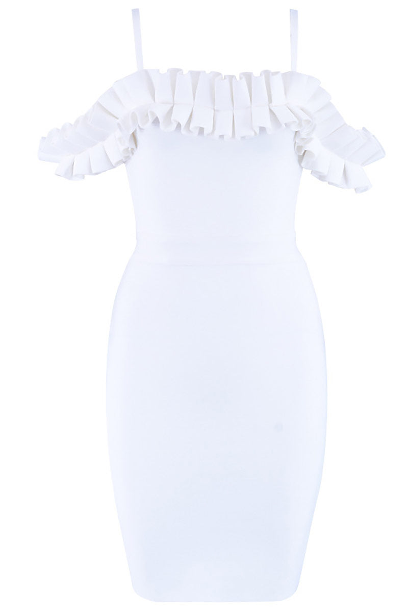 White Off-the-shoulder Ruffled Spaghetti Strap Party Dress.