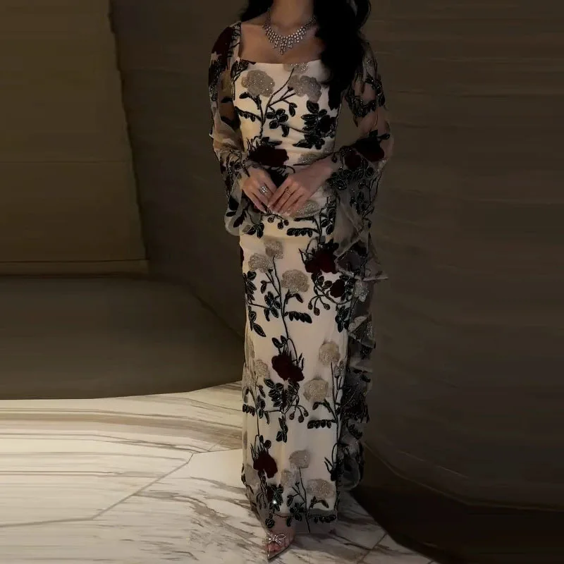 Elegant Black Rose Floral Long Sleeve Evening Dress for Women